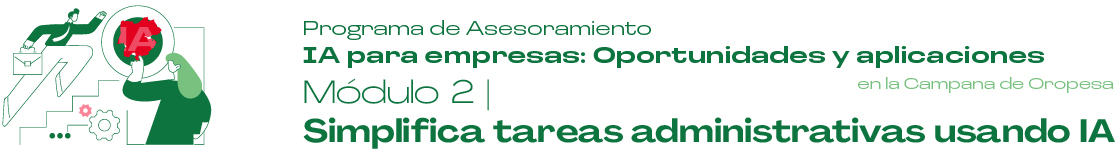 Inicio 5 Programa de Asesoramiento 4 5 Módulo 2: Simplifica tareas administrativas usando IA Volver atrás Módulo 2 Recursos del Módulo Contenido teórico Acceder Podcast Acceder Ejercicio práctico Acceder Lecturas complementarias PCómo Aplicar la IA en tus Tareas Administrativas P8 Procesos que se Pueden Automatizar con IA PImpulsa tu departamento de administración con IA: aumenta eficiencia y reduce costos PLa IA y el futuro del trabajo: tendencias y estadísticas Vídeos complementarios PCómo usar ChatGPT para redactar: Correos y solicitudes - Curso de ChatGPT P¿Qué es la inteligencia artificial? PConvierte Excel en una Herramienta de IA con ChatGPT